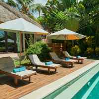 Большой бассейн с видом на океан, деревянным деком с четырьмя лежаками. На берегу бале с видом на океан.